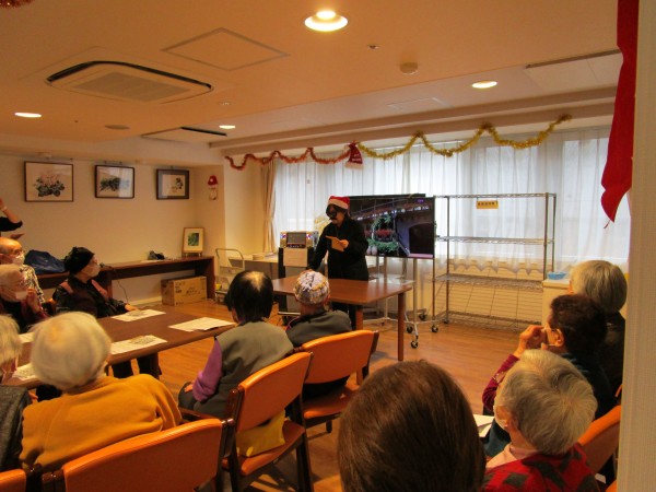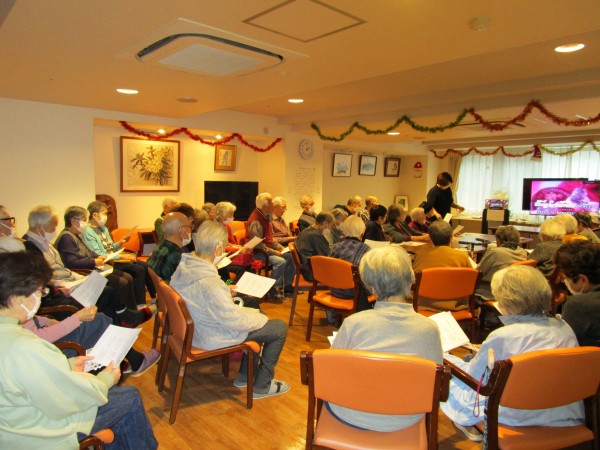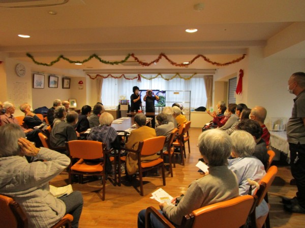 昼食はクリスマスバージョン(ケーキ付)の行事食、そして13:30~北野の郷 クリスマス会と盛りだくさんの行事が行われました!クリスマスメニューでお腹を満たした後は、クリスマスソングを皆さんで歌い、ビンゴゲーム、郷の職員による手品を行いました。とても楽しかったよとの入居者様からのお声をいただきました(*^-^*)